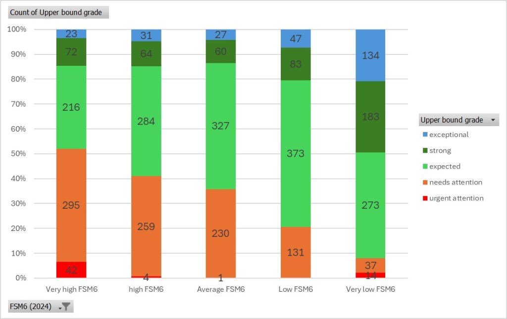 - “Very High FSM6” schools have the lowest proportion of “strong” or “exceptional” outcomes and the highest proportion receiving “needs attention” or “urgent attention”.
